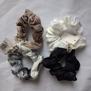 Stylish scrunchie set by lokks. Includes black, white, and brown colors. Perfect for versatile styling.