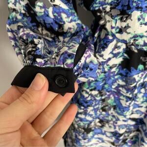 Colors are black, white, grey, purple, blue, and turquoise(?) in a floral or watercolor abstract print. I personally think some of it looks a little like Rorschach images!