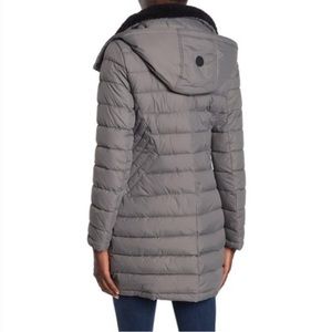 French Connection faux shearling trim hooded puffer coat in grey. Brand new with tags.