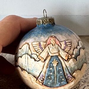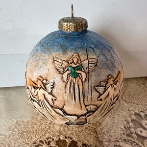 This exquisite handcrafted ornament features a serene angel design in blue and cream tones. Perfect for adding a touch of elegance to your holiday decor.