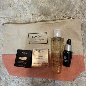 Lancôme skincare set featuring creams, serum, and a cosmetic bag. Elegant gold and black packaging with a stylish pink and cream bag.