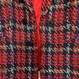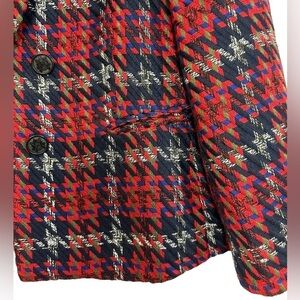 Gorgeous plaid jacket with detailed buttons down each side. Open design with notched collar, slash pockets and fully lined. If you have any questions or need more pics, just ask:) Thanks for looking and I ❤️ offers!