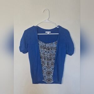 New York & Company short sleeve layered-look cardigan in size XS. Features a royal blue knit outer layer with an attached patterned inset panel for a faux layered blouse effect.