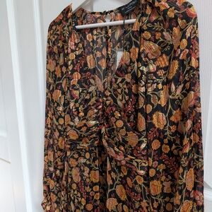 Elegant floral maxi dress with sheer long sleeves, perfect for any occasion. Low cut neckline with a keyhole zipper back and decorative buttons up front. Built in slip.