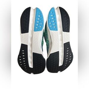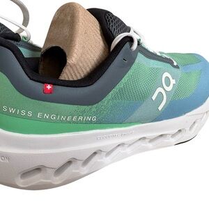 Stylish On Running sneakers. Features blue and green upper. Comfortable and lightweight design.