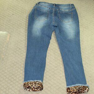 Women's M High Rise Leopard Print Repair Roll Up Leopard Print Raw Hem Blue Jean