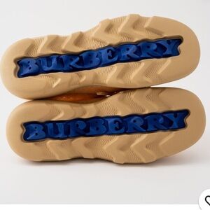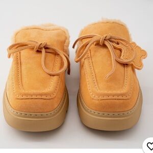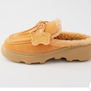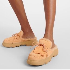 Elegant Burberry mules with plush shearling. Luxurious suede finish. Perfect for cozy style.