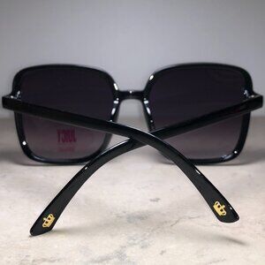 Juicy Couture sunglasses that feature a bold, oversized square frame in glossy black, giving off a glamorous and sophisticated vibe. The lenses have a soft gradient tint that transitions from dark to light, offering 100% UV protection as indicated by the logo on the right lens.