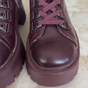You'll love the comfort and style of these super modish casual boots from Call It Spring. These beauties are in excellent preowned condition ! Chunky platform, ankle height and cool lacing system. In a stunning burgundy red tone and best of all, they are cruelty free vegan!