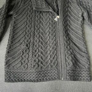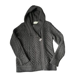 Aran Crafts Ireland 100% Merino Wool Side Zip Hooded Cable Knit Cardigan Black M