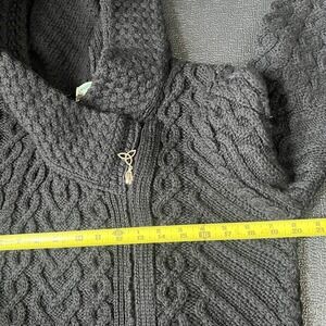 Aran Crafts Ireland cardigan features a heavy cable knit construction crafted from 100% Merino wool. This black sweater is designed with a unique side-zip closure adorned with a Celtic trinity knot pull and includes a cozy integrated hood. Front pockets are subtly integrated into the diagonal knit pattern, while the traditional Irish craftsmanship ensures both warmth and a timeless aesthetic. In excellent preowned condition.