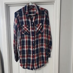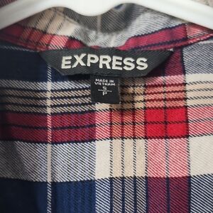 Vibrant plaid shirt by Express. Features red, blue, and white checks. Ideal for casual outings. Tunic length, all of the buttons are intact and no loose threads.