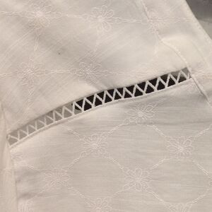 This chic white blouse features elegant lace accents and a stylish button-up front. Perfect for both casual and formal settings, it offers a versatile and timeless look.