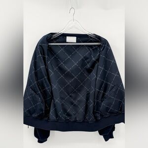 Dark blue with white piping throughout, and embroidery on sleeve. Slouchy sleeves. Lined with silky material and allover logo print. 2 front pockets, 2 interior pockets. Ribbed cuffs l, collar and hems. Full zip and button closure. Vintage.