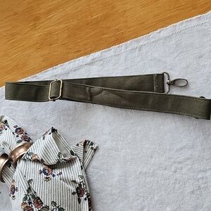 It can be worn as a crossbody, shoulder, or held by hand. The shoulder strap clips to the inside rings and is adjustable. There is no signs of wear and comes from a smoke free home.
