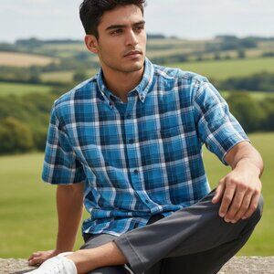 This stylish men's shirt by Marks and Spencer features a blue harbor blue and gray plaid pattern, with short sleeves and a collared neckline. The shirt is made of high-quality woven cotton fabric, ensuring comfort and durability. It has a regular fit and comes in size medium, making it perfect for any casual occasion. The button-up closure adds a touch of sophistication to the shirt, while the point collar style gives it a classic look. This shirt is a must-have for any fashion-conscious man who wants to look good and feel comfortable.