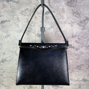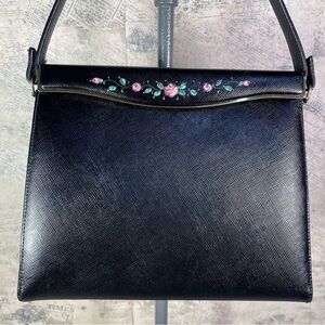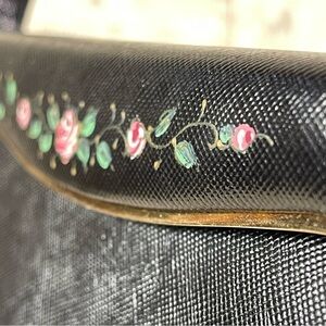 Etra Purse Vintage 1960's Black Leather French Hand painted with Pink Flowers