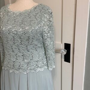 Charming lace dress with long sleeves. Mint green hue adds elegance. Ideal for formal events. Tea length