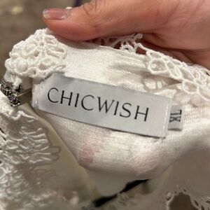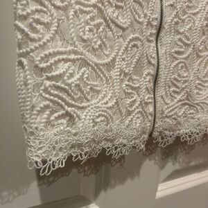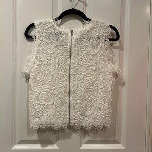 Chicwish women’s sleeveless lace top in white, size XL. Features an intricate textured lace design with a delicate scalloped hem and neckline. Feminine and elevated piece that works well dressed up or paired casually.