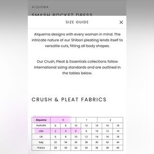 Size chart attached. The dress is super stretchy given the crinkle design so it has a lot of give. Very classic elegant design.