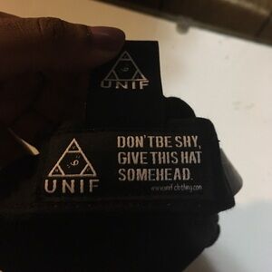 Stylish black cap by UNIF. Features bold white embroidery on the front.