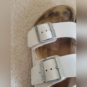 birkenstock arizona white birkenstocks size 39 euro 39 comfort sandals cork footbed slides two strap sandals summer shoes casual neutral sandals leather straps buckle sandals worn birkenstocks fair condition birks