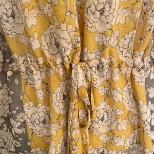 Everyone will gather around to admire your outfit wearing the Cabi gather blouse. Done in a Marigold flower print, this blouse is longer in the back and has billowy raglan sleeves. Even has a drawstring back for bonus styling.