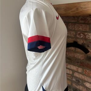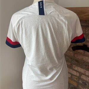 White Nike soccer jersey. Red and blue sleeve accents. USA emblem and Nike logo featured.