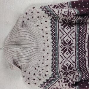 Elegant cowl neck sweater with intricate patterns. Soft cream and rich purple design. Perfect for cozy days.