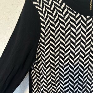 Dana Buchman Features a prominent black and white chevron (zigzag) pattern on the front, while the sleeves and back are solid black. It includes a gold-accented zipper on the back for added detail. Typically made from a blend of cotton and viscose.
