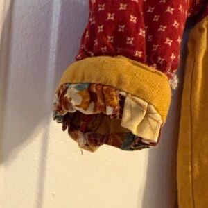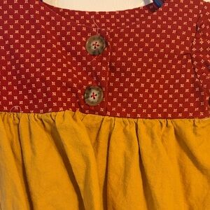 Delightful kids bodysuit in a charming red and yellow combination. Ideal for fun-filled days. Does have a broke snap on the bottom, the button is still attached as shown in the photo.