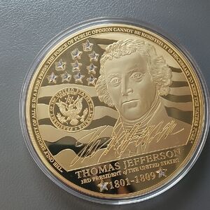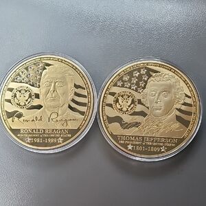 Set of gold commemorative coins featuring Ronald Reagan and Thomas Jefferson. Intricate designs with presidential portraits and signatures.