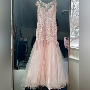 Elegant pink prom dress by Anny Lee. Features intricate lace detailing. Flattering mermaid silhouette.