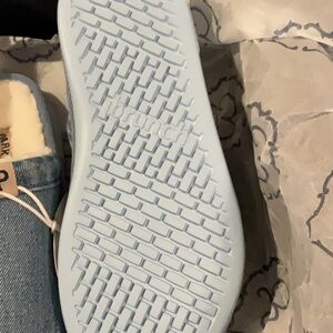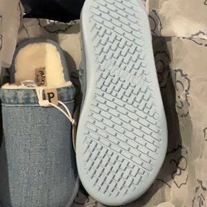 Soft denim slippers with plush interior. Easy slip-on style. Size W8/M7