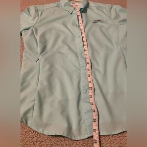 EUC, like new. Small snags on front of shirt, barely noticeable, see photo. Light green button-down shirt by Columbia. Casual and stylish. Ideal for everyday wear. Dual snaps on cuffs. Snap on sleeve to hold sleeve in place when rolled up. Zippered front pockets. Includes breathable mesh. Lightweight, great for hiking.