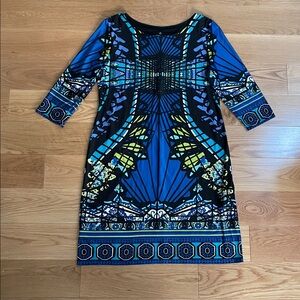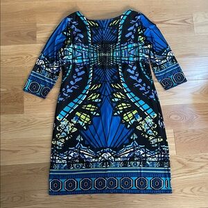 This sheath dress from Ronnie Nicole reminds me of a stained glass window. I love how the back matches perfectly at the seam. Fully lined with a scoop neck and 3/4 sleeves in excellent condition. Size 14.