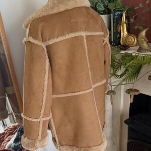 Stylish tan shearling coat with faux fur trim. Features large pockets and a cozy design. So so soft!! New with tags.
