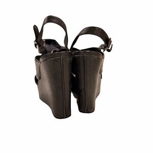 Elegant black wedges with open-toe design. Adjustable strap for a secure fit. Perfect for versatile styling.