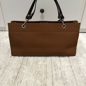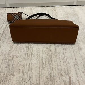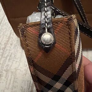 Stylish Burberry london blue label handbag featuring a brown body with phone pouch can be attached inside or outside. Perfect for any occasion.