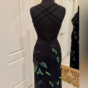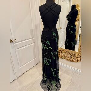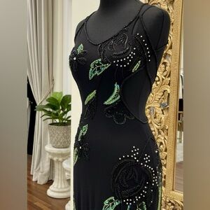 Elegant hand, beaded Black and Green floral with rhinestone Maxi Dress