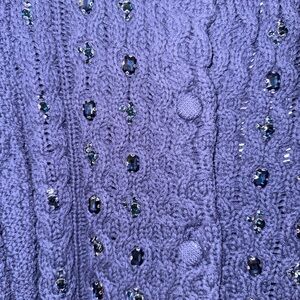 Elegant deep blue cardigan with intricate cable patterns and gem embellishments. Features a round neckline and button closure. Perfect for layering. Pit to pit is 22”. Length is 22”. NWT