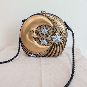 Unique handbag with a gold crescent moon and silver stars. Features a black rope strap. Artistic and eye-catching design.