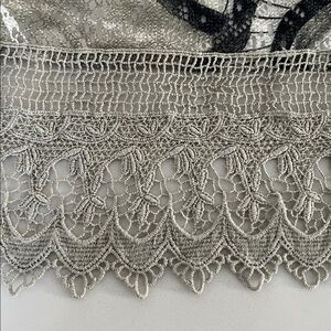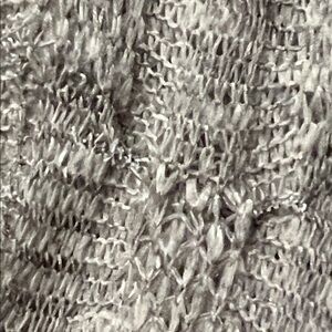 Elegant lightweight long-sleeve open cardigan with intricate floral patterns. Features a blend of taupe, blue and white. Machine washable. Some stretching present (as shown)