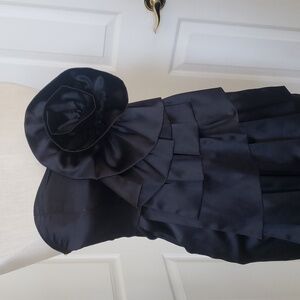 A sleek black satin strapless mini dress by SOLEMIO, featuring a dramatic cascading rosette and ruffles that add instant special occasion glamour. The structured bodice, tiered front ruffles and concealed back zipper create a flattering, feminine silhouette perfect for cocktail parties receptions, and evening events. Includes pockets, a satin finished, rosette detailed, and a chic strapless design. Excellent condition.