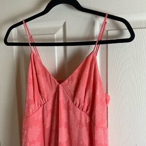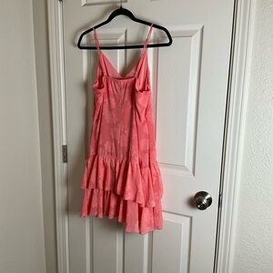 Chic pink floral dress with ruffle details. Features a mini-length silhouette, V-neckline with triangle cups, open back with adjustable shoulder straps and tiered, asymmetrical frilled hemline. Pullover style completes the look with easy on and off.
