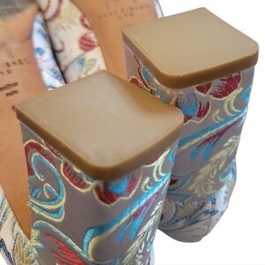 Floral brocade print, 2.5" back heel, leather inside.