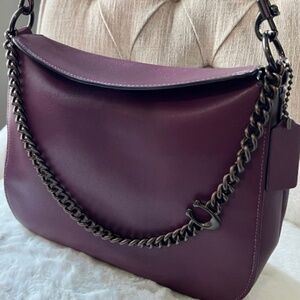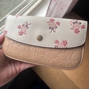 This is a NWOT bag and card holder. It has only been used ones. The main color is a pale pink with red and pink heart embellishment. It comes with the cross body strap.