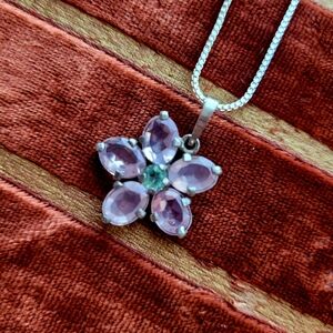 Vintage 18 inch stainless steel maybe unmarked sterling necklace with a vintage gemstone flower pendant, good vintage condition, non-smoking, sanitized, very beautiful vintage flower necklace.