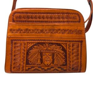 Keywords: tooled leather bag, vintage handbag, shoulder bag, aztec design, mayan design, leather purse, boho bag, ethnic bag, vintage leather, festival bag, crossbody bag, womens bag, unique handbag, southwestern bag