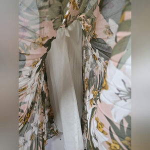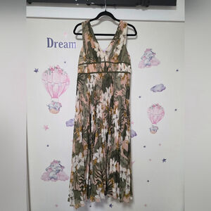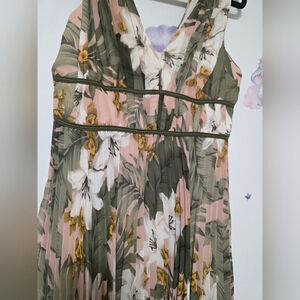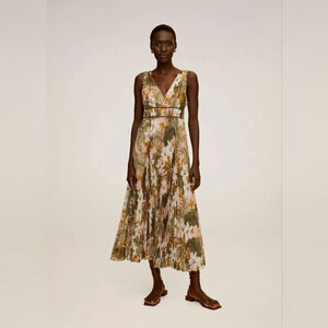 Pleated fabric, Floral print, V-neck, Wide straps, Flared design, Fitted waist, Zip fastening on the back section.